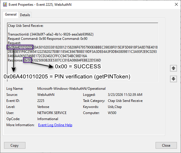 | Therefore, Ctap Usb Send Receive events (Event ID 2225) where the Request starts with 0x06A401010205 will report all security key PIN attempts, both successful and unsuccessful, on the client device. |