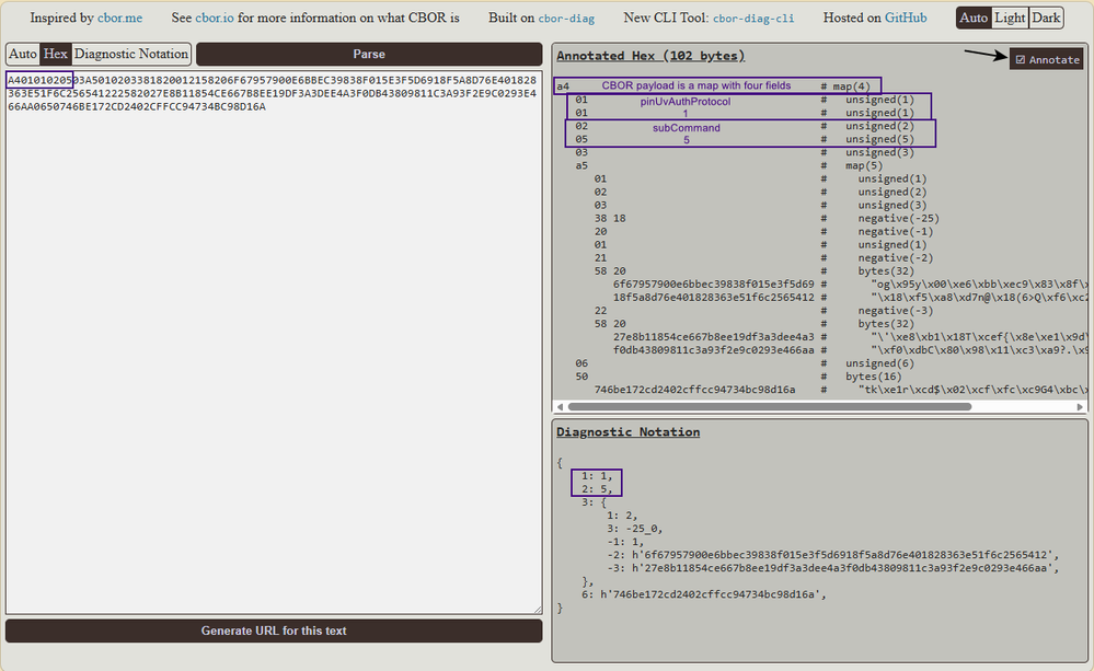 Turn on Annotate if you want the CBOR Playground site to show how each byte is interpreted.