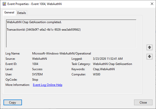 Finally, the WebAuthN Ctap GetAssertion completed event (Event ID 1004) tells us that WebAuthN GetAssertion operation completed successfully for this TransactionId.