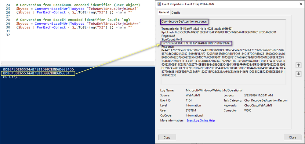 The key identifier from Entra ID when Base64 decoded will match the CredentialId in the event.