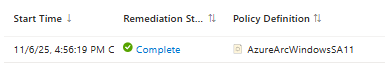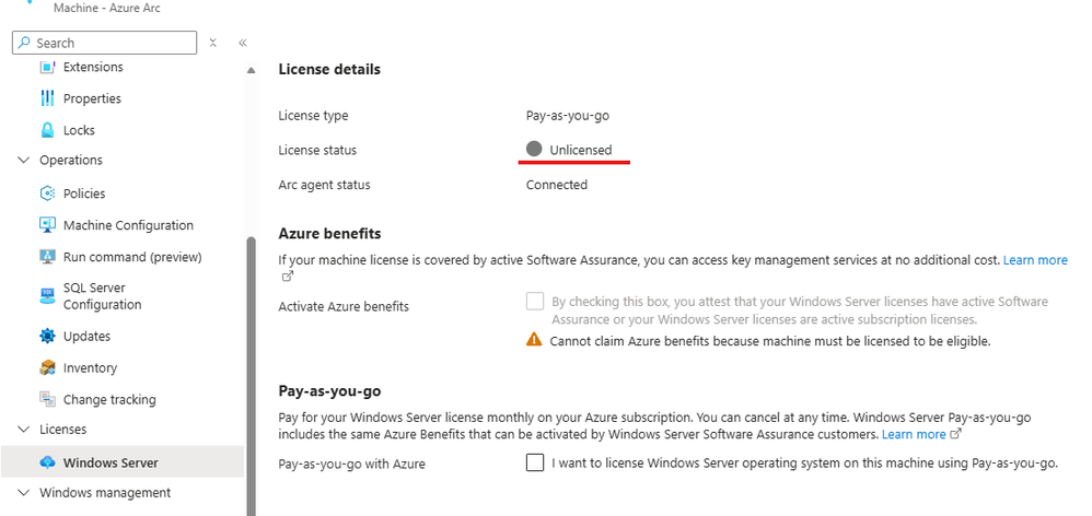 When a Windows machine is deployed using Pay-as-you-go, as an example a new Windows Server 2025 machine, the status of the license after creation will be “Unlicensed” as shown below. The policy is not evaluating Unlicensed machines. The machine will need to have the Pay-as-you-go with Azure check box checked at least one time to “License” the machine.