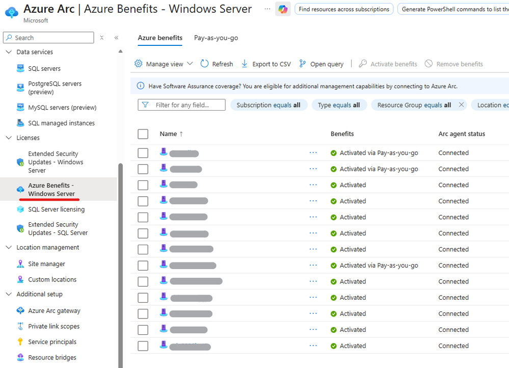 Note – Ensure that your organization has the proper Software Assurance Benefits to cover the machines that are being assigned. Please reference this link for billing information Windows Server Management enabled by Azure Arc - Azure Arc | Microsoft Learn