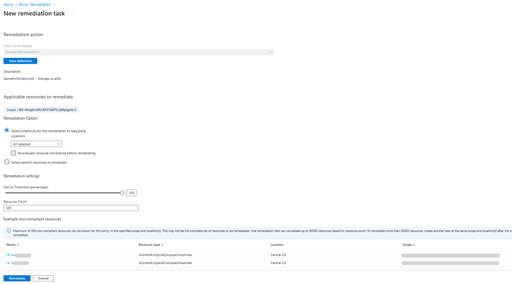 Choose between the two radio button options for remediating all the selected locations, a single location, or select specific resources to remediate.