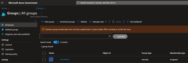 Begin by connecting to your subscription in the Azure Government Portal. Then, navigate to Azure Active Directory > Groups