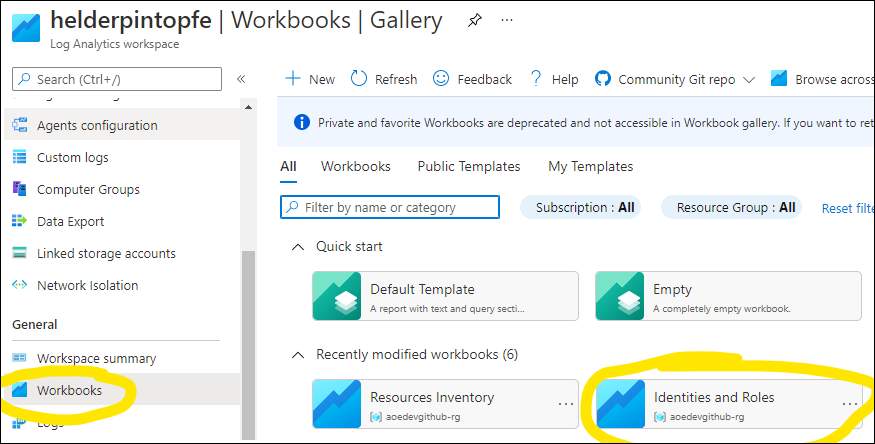 Log Analytics workspace workbooks list including the Identities and Roles workbook