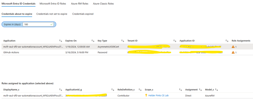 The workbook is then divided into three main tabs, dedicated to the following perspectives: Microsoft Entra application credentials, Microsoft Entra ID roles and Azure Resource Manager roles. Looking at the first one, inside the Microsoft Entra ID Credentials tab, we find other three sub-tabs, with the first one dedicated to application credentials that are about to expire. The expiration time range is adjustable as a filter. If you click on a specific credential, you can also verify which Microsoft Entra/Azure RM roles and scope this credential has.