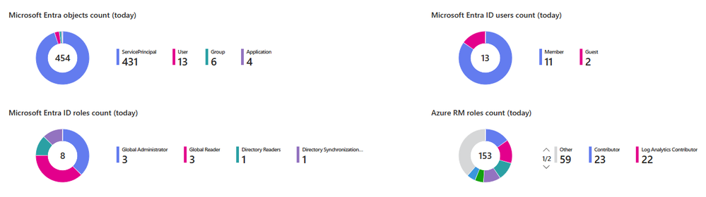 The Identities and Roles Workbook starts with summary header displaying the Microsoft Entra ID objects count as well as a count of roles these objects have both in Azure and Microsoft Entra ID.
