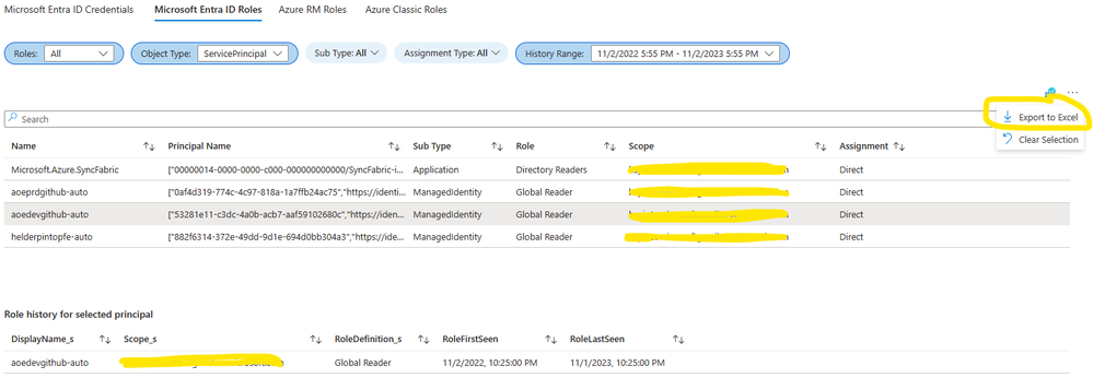When you click on an object/role record, you can check for how long that role has been granted. This information depends on the History Range filter you chose and, of course, on the data retention settings you defined for the Log Analytics workspace. For many views in this workbook, you can also export the results as an Excel file.