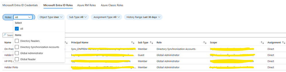 Moving on to the Microsoft Entra ID Roles main tab, we’ll find all the directory objects that have some role in Microsoft Entra. You can filter by role or by object type (Service Principal or User). As you can see in the screenshot below, only currently assigned roles can be used as filter.