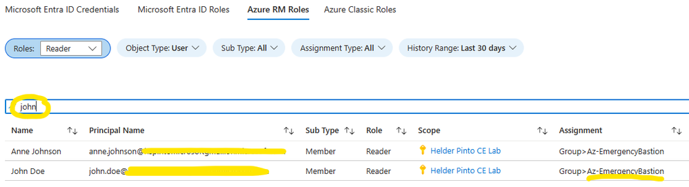 Azure Resource Manager roles with principal name search and direct vs. group assignments