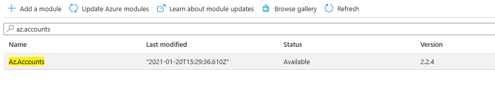 the following modules to be imported in the modules section of the Automation Account in the Azure Portal: