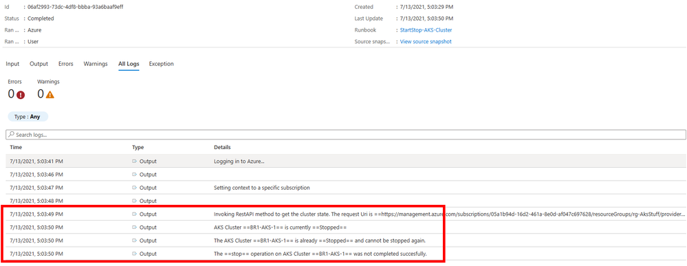 The runbook will first check if the required operation on the given cluster can be performed. For instance, if you requested to stop the cluster and the cluster is already stopped, the runbook produce some log entries similar to those below: