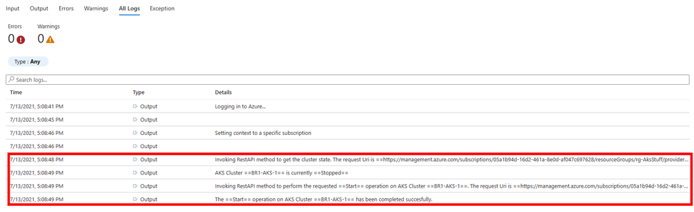 If the cluster was in the Stopped state and your request is to start it, then the runbook will go ahead and you will see logs similar to the screenshot below: