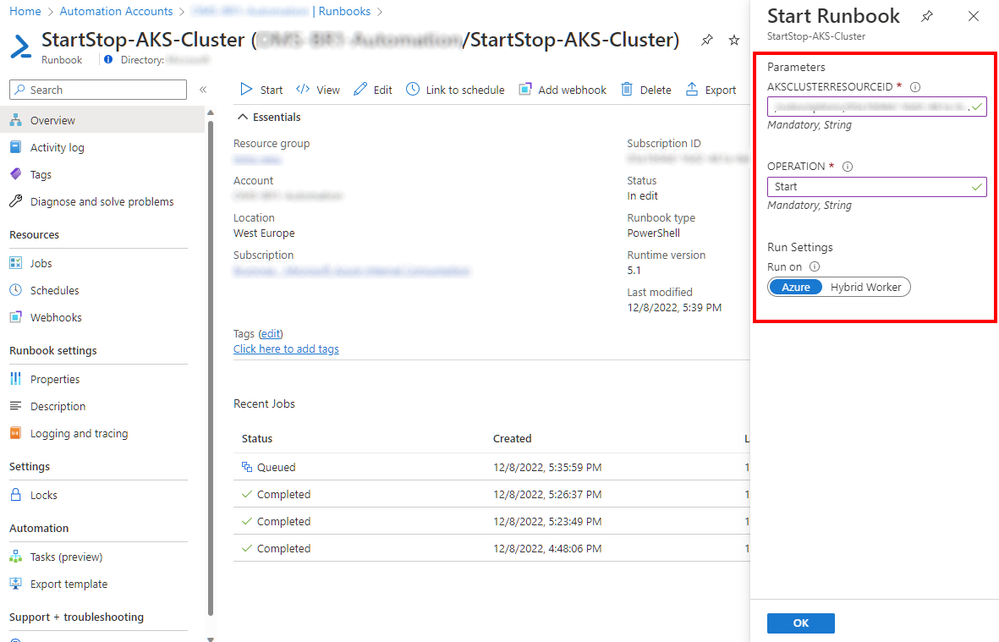 This sample automation runbook is designed to manage the start and stop of aks clusterson a given schedule. You need to provide some parameters. This runbook requires also