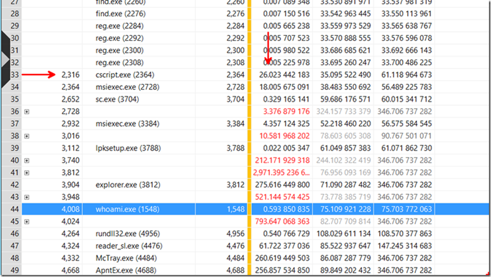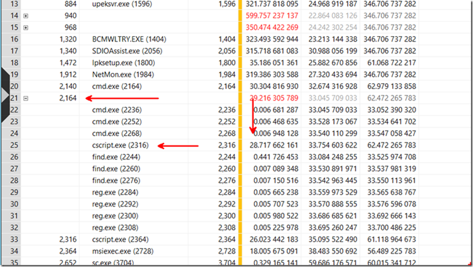 This script is busy, they always are. The one that seems to be our bottleneck is a Cscript.exe with the process ID of 2,316 is taking 28 seconds to complete. If we scroll to the right we will see the command being launched.