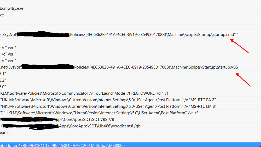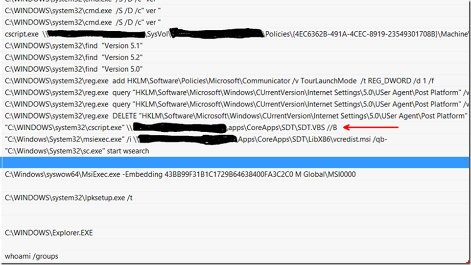 The top arrow is our original script; the second arrow is process 2,316. It is calling another script, startup.vbs. It also appears to be coming from the same group policy which is confusing, in general, but that is a different issue altogether. As we push on, let’s go investigate what child process are being kicked off from process 2,316.