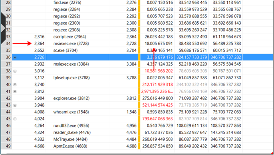 Here we can see that cmd.exe process ID 2,164 is taking 30 seconds to complete. We also see that it kicks off 3 other child processes, 2,236, 2,352, and 2,268. Those run very quickly but we are able to tell this is where they came from, as they all share the same Parent Process ID, 2,164. Understanding this parent child process relationship will help us to continue to drill down. For now if we scroll to the right to look under Command Line to see what is being called:
