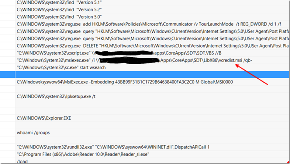 Finally not another script! We can see that this process, 2,728 spawned from SDT.vbs 2,364 is doing an install of some sort. It is also taking 18 seconds complete. The line directly above it (33) is its parent and is taking 26 seconds as we can see above. I don’t have a network trace to confirm this but I’m suspecting it is taking roughly 12 seconds to map the drive to launch the SDT.VBS script. Let’s scroll over to see what all this trouble was for: