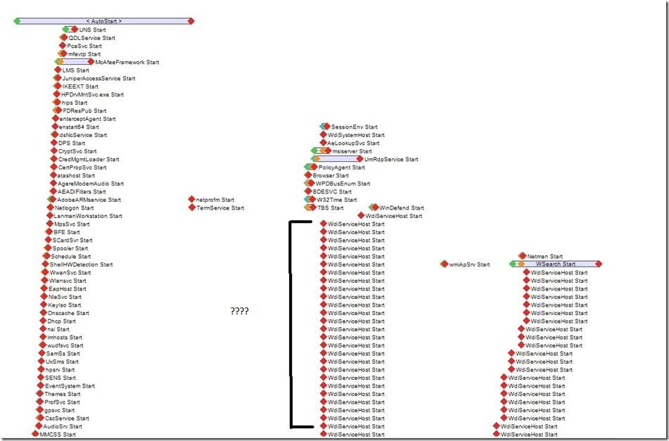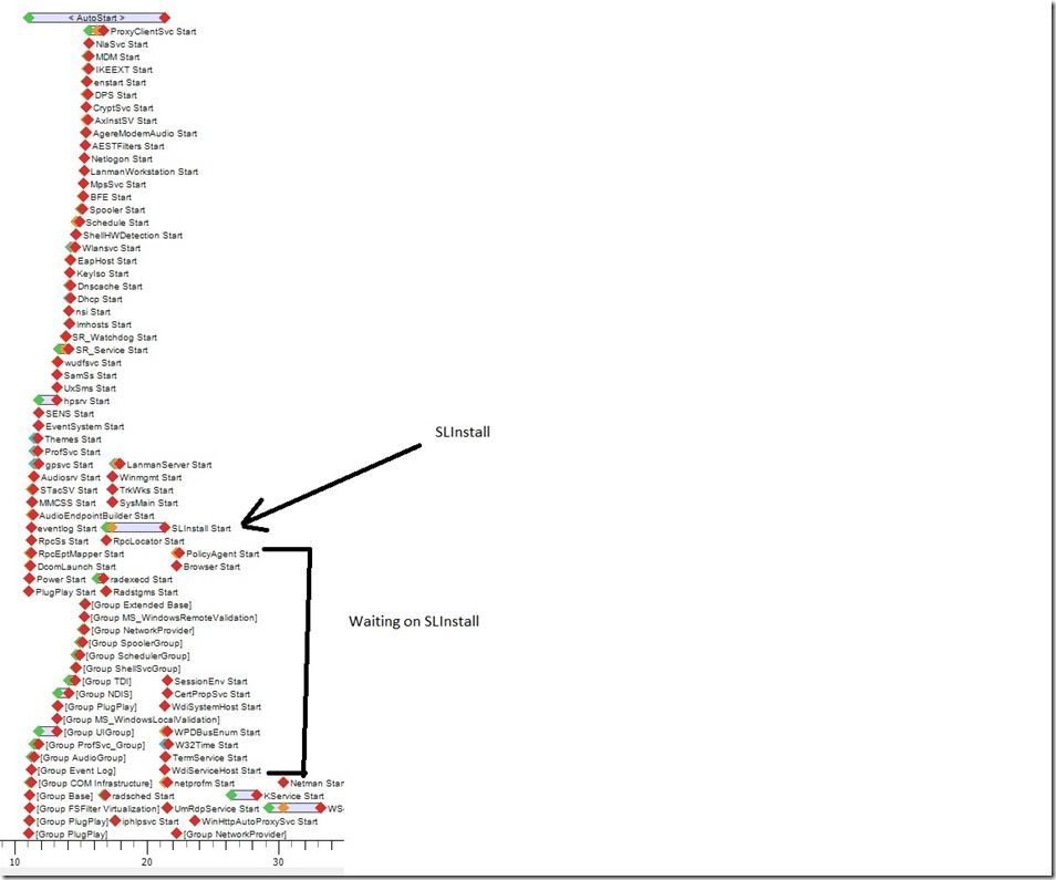 Parts of the boot process will not begin until the AutoStart group has completely finished. Also evident in this trace is that the SLInstall service is sort of holding up things for us. As soon as SLInstall finished, a bunch of other services such as W32Time, SessionEnv and Browser all start around the 24 second mark. Determining why this service is taking so long to start, or even moving it to a “Automatic (Delayed Start)” might speed things up, but that’s not what this blog post is about. Instead, I would also say this trace is good enough or “normal” looking.