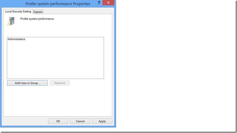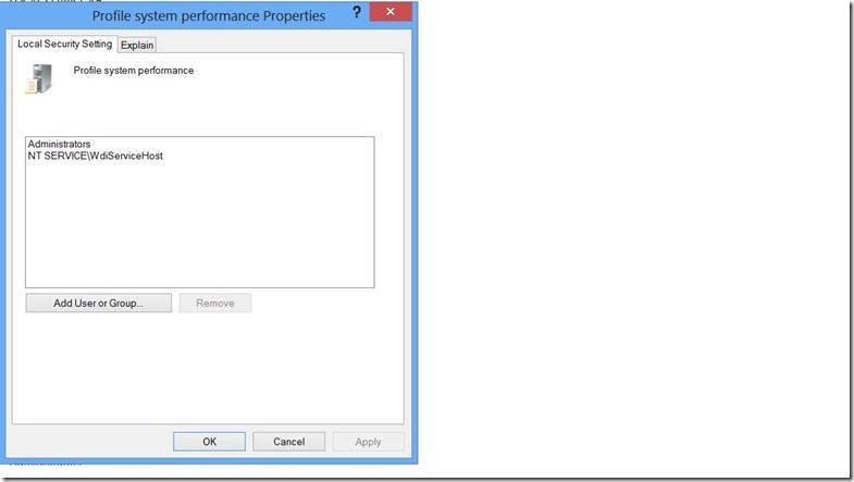 Generally this part is not changed but they’ve actually removed this account from the “Profile System Performance” User Rights Assignment. To check launch the Group Policy Management Council (gpedit.msc). Drill down to Computer Configuration, Windows Settings, Security Settings, Local Policies, User Rights Assignment. This is what you might see.