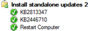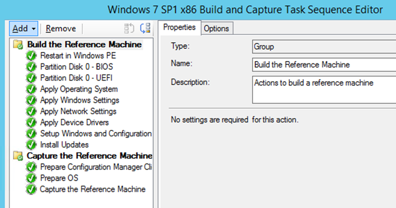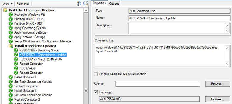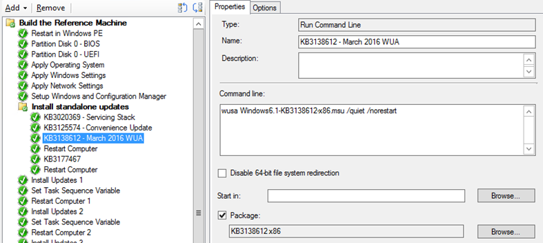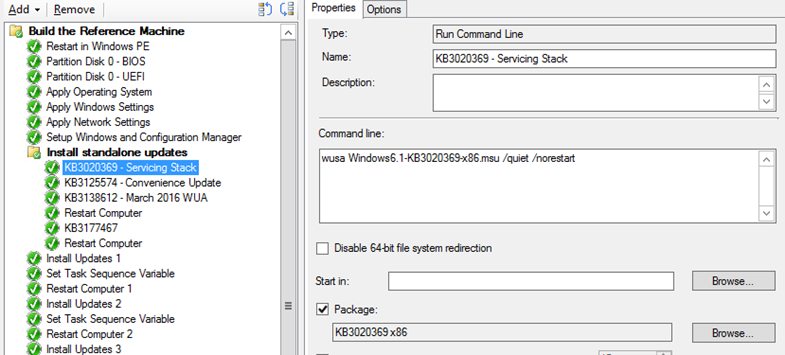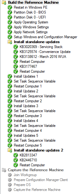 Hi everyone, my name is Nicholas Jones, System Center Configuration Manager Premier Field Engineer, and I'd like to share some work I've been doing on building and capturing images. You might be a little surprised to see a blog post on building Windows 7 images on an official Microsoft blog. Make no mistake: we recommend our customers switch to Windows 10 to take advantage of huge advancements in security . While we advise our customers to switch to our most secure platform, Windows 10 , we realize many of you must support and deploy Windows 7 while your migration projects are underway. If that is the case, we want to ensure you're deploying Windows 7 with all needed security updates. Second to the security conversation, there is potential to save your company some serious man hours. Imagine your company is deploying roughly 100 Windows 7 instances per week. Now imagine if we were installing dozens of updates, on the fly, during or after that process. That could easily add 30 minutes to the deployment. Multiply that by 100, and well, you can do the math… I'll be using System Center Configuration Manager for this tutorial, mainly because that's my specialty, but these instructions can be adapted for other products. I realize many people use MDT to build their images, so that they can customize the default user profile and maybe for other reasons. The goal of this exercise is to have a Windows 7 image that can be deployed which minimizes, if not completed eliminates, updates required by Microsoft Update. This article does assume that you have a working knowledge of Operating System Deployment in Configuration Manager, so I won't be covering things like content distribution and creating task sequence deployments. Sounds simple, right? Let's get started. First, we will need a copy of Windows 7 SP1. You can grab the ISO from your Volume Licensing Site. Make sure you have the SP1 copy and not RTM. In the Configuration Manager console, we will need to copy the install.wim file from the ISO to our source share, like in the screenshot below. The exact path you use will vary on your environment. We'll import that WIM to Configuration Manager, and name it something like "Window 7 SP1 x86 – Original". Any name is fine, but make sure it's obvious this image is only used for building and capturing reference images. You wouldn't want to slip this in to a production task sequence. After our image imports, we can move on to creating the task sequence. Go through the steps of creating a basic build and capture task sequence and make sure to reference the image we just imported. It will look like this when you're done: So, why can't we stop here? Because there have been so many dramatic changes to Windows 7 over the years, it's going to take a few special steps to make sure our build and capture actually works. The Install Updates step simply will not install the hundreds of updates you would need. On top of that, the Windows Update Agent that is built in to the original Windows 7 SP1 media may not work reliably. There is also the change to Windows servicing that happened late last year and the convenience update we released, so we're going to use those to our advantage. Here is the complete task sequence (ignore the disabled Capture section): Let's talk about the logic here and walk through the steps. The first custom section you'll notice is called "Install standalone updates". The goal here is to get the convenience update installed, and to get a decently modern Windows Update Agent installed. The convenience update requires a servicing stack update, so we're installing that first. …next is the convenience update. …and finally, we have the March 2016 WUA. (If you come across a newer WUA, use that instead.) You'll want to follow this with a restart. You'll also notice that I'm installing KB3177467 at the end of this group . Due to a known issue when installing this update with other updates, I really did not have much success with this project until I separated this update from the others. So far, things are straightforward. What comes next is a little odd and specific to Configuration Manager, so hopefully I can explain this well enough. I wanted to create two groups of updates to install during this build and capture. I want one group to go first, then a second group to be evaluated last. The logic behind this is to apply whichever Security Monthly Quality update is available first, then apply all of the remaining updates that are needed. I create two Software Update Groups (SUG) for this. "Windows 7 Build Required" contains the latest Security Monthly Quality update (January 2017 at the time of this writing). I want this update to apply before any other updates, so it's deployed to my build collection as required. "Windows 7 Build" consists of all the remaining updates that the image needs, post convenience update and Security Monthly Quality update. I want to apply these last, so I deploy it as available. Back to the task sequence: Install Updates 1 and 2 are set to only install required updates. This ensures we're only looking at the small update group which contains the monthly update. I repeat this step twice, just in case I add some updates to that group later, which are prerequisites for other updates in the same group. If you're only installing the monthly rollup, you can remove the second group of 'Install Update, Set TS Variable, Restart Computer'. On the third through fifth steps, I'm checking for all software updates. This allows the process to check the remaining updates after the monthly rollup has been installed. I repeat this three times to catch all of the updates. The Set Task Sequence Variable steps set SMSTSWaitForSecondReboot to 600, just in case I'm running into a Configuration Manager specific problem with updates requiring two restarts. Identifying the updates that are needed in that second group is tough. You could run through this process with only the 'required' updat
