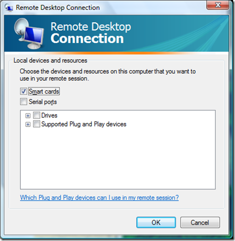 - Under the Options >>> button on the Local Resources tab under the More … button, Smart cards was check-marked. That setting caused the Microsoft Terminal Services Client to map my smartcard into the remote desktop session.