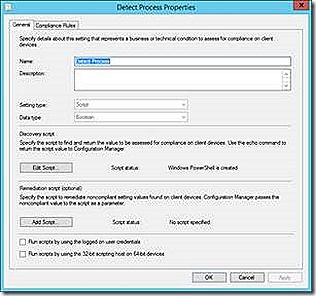 The sample PowerShell script below is used to detect whether the WordPad process (or any process) is running multiple times. The script initially sets the $compliance variable to true to indicate compliant and then proceeds to test the condition. If a non-compliant scenario is found the $compliance variable is changed to False.