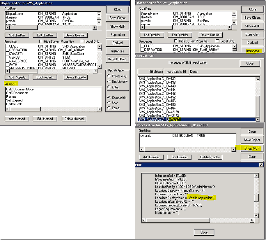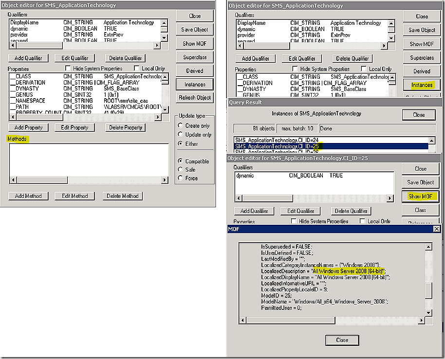 Back to the first point. If the SMS Provider is responsible for adding information to the database, but there are no WQL insert statements to get that done – how does it work? Glad you asked. You will notice the first line of the log snip 1 above is calling a method called DoCreateInstanceEnumAsync against the SMS_Application namespace. This method is code that specifically is used to create a new instance in a WMI class, in this case the class is SMS_Application. Half way through log snip 1 you will see an insert called again but this time against the SMS_ApplicationTechnology class. These types of references are found throughout the SMSProv.log and specifically indicate that something is being added to WMI. We don’t use queries to do that, we use methods. Some methods are internal and some methods are defined right on the class. From the log information above we know two of the key classes related to applications – SMS_Application and SMS_ApplicationTechnology. Reviewing these classes reveals that one has methods defined and the other doesn’t. When present, the methods are useful for interacting with the information stored in the class. Working through these classes using WBEMTEST we can see the detailed information stored there as shown. Note that configuration item (CI) 45367 in the SMS_Application class represents the application we just created – and you will see this again later. This is your first indication that a created application is defined as a CI. Note that the CI 25 is the one of interest on the SMS_ApplicationTechnology class. We will see how these are all related when we get into the database. Just know for now that information about these CI’s is stored in WMI as well.