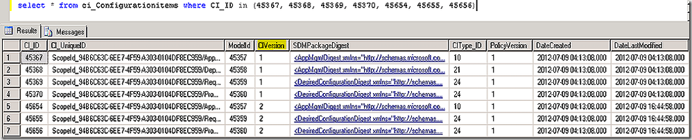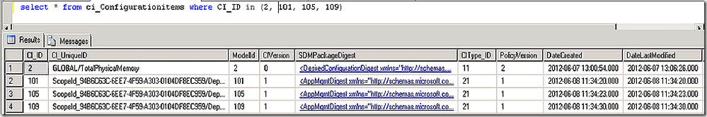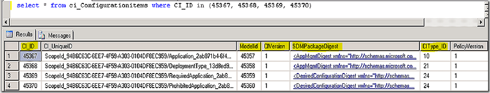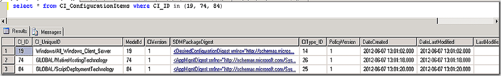 We see that some of the relationships are simply our four CIs relating to each other but in this list we see several additional CIs – specifically 18, 74 and 84, showing as related items for each of our newly created CI’s. If we query the CI_ConfigurationItems table for these new CI’s and review the SDMPackageDigest value for each we better understand their purpose.