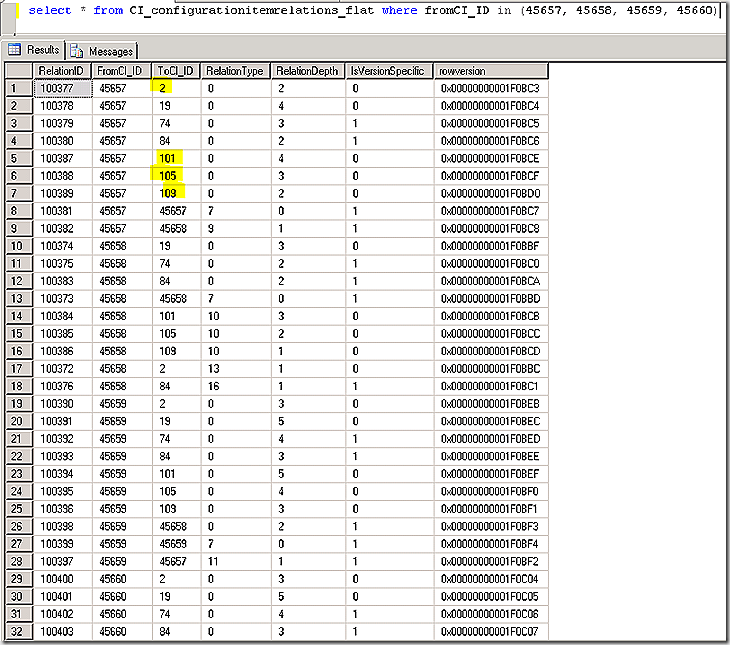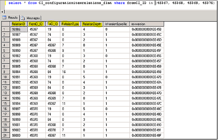 In the CI_ConfigurationItemRelations_Flat table we also see a column called relationdepth. This value simply defines how many layers deep a relationship spans.