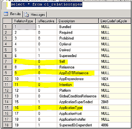 Also interesting from our relationship query results is the RelationType value. The CI_RelationTypes table defines what the various types of relationships can be. We will see that as various relationships – such as rules, dependencies or supercedences – are added to an application the relationship mapping will increase. Looking back at the relationships mapped on our application CI’s created we find relationship types 0, 7, 9, 11 and16 in use. If we query the CI_relationshiptypes table we see how those are defined. Note, a relationship ID of 0 means no relationship is in place.