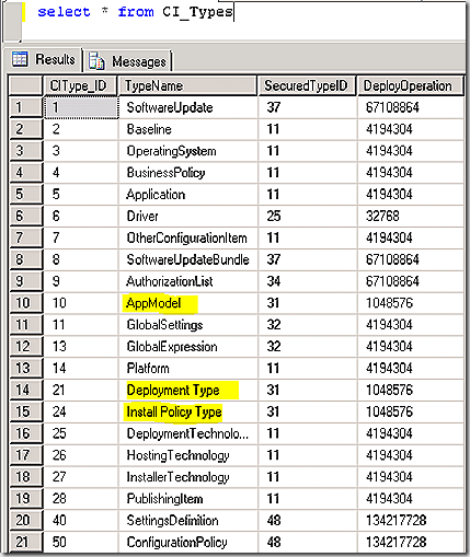 OK, one other item to cover before a change is made to the application we just created. Back to the CI_ConfigurationItems table we see a column called CI_Types. This column defines the type of CI being defined. As mentioned before, there are various types of CI’s possible in the system, all use a common framework. For the application we just created there are several CI_Types listed – 10, 21 and 24 with 24 listed twice. To find out what these configuration items are simply query the CI_CITypes table to see the list.