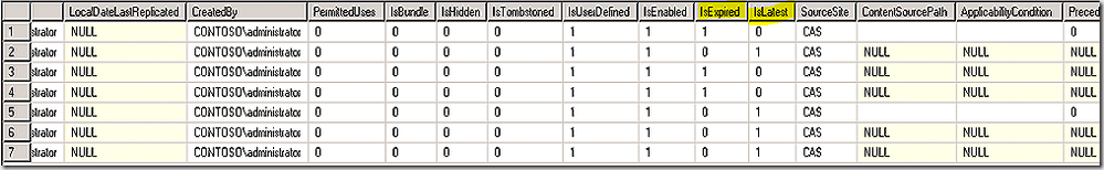 Ah, so some things start to come clear. If we examine the result we see the latest three CIs are all version 2. We also see that with version 2 we cause version 1 CIs to become expired, as reflected in the IsExpired column, and also cause version 1 CIs to be shown as no longer the latest version, as shown in the IsLatest column. Note that theCI defining the deployment type is still valid because we didn’t change anything related to the deployment type, just the main application definition.