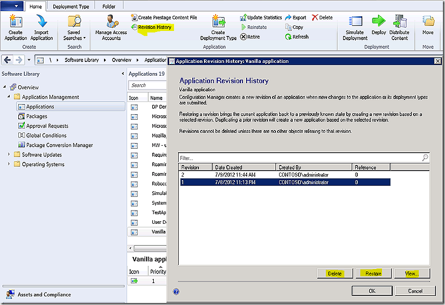 With just this simple exercise we see that changes to an application do NOT cause existing CIs to be overwritten. Instead, additional CIs are added and the previous versions are marked expired. Why preserve information in this way? Glad you asked. If you recall one of the new features of the application model is the ability to track revision history and, if needed, cause a previous version to be restored, as shown for our application. This feature would not work if previous CIs were deleted.