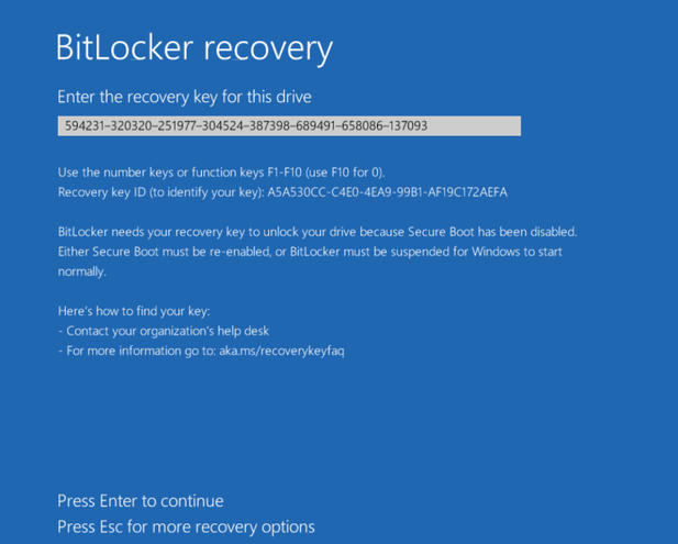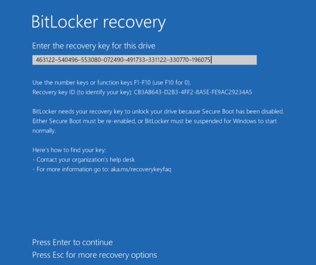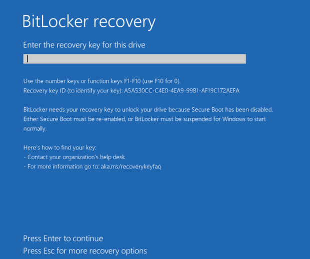 - At Bitlocker recovery screen, note first 8 characters of recovery Key ID