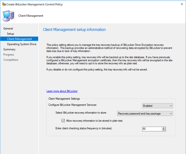 - Note: if no Bitlocker management encryption certificate, you can’t continue to next tab without check box “Allow recovery information to be stored in plain text". if you consider encrypting key recovery information in site database at later stage you can do so follow the article https://docs.microsoft.com/en-us/configmgr/protect/deploy-use/bitlocker/encrypt-recovery-data to encrypt key recovery info in database