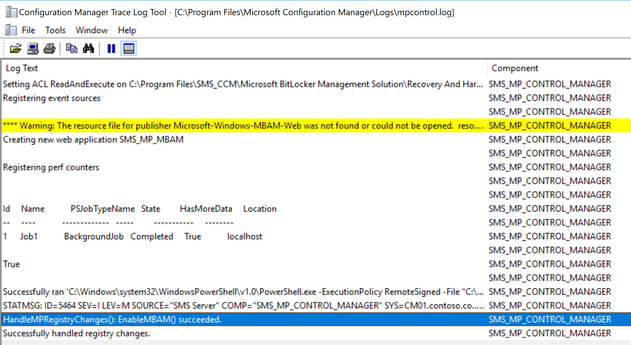 Successfully ran 'C:\Windows\system32\WindowsPowerShell\v1.0\PowerShell.exe -ExecutionPolicy RemoteSigned -File "C:\Program Files\Microsoft Configuration Manager\bin\x64\mbamrecoveryserviceinstaller.ps1"'. Exit code = 0.