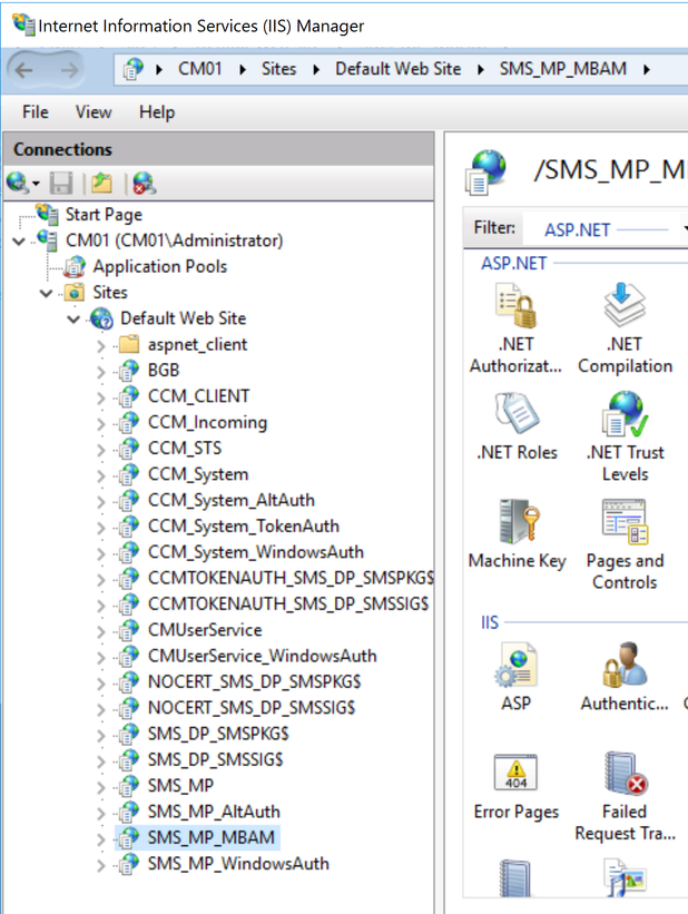 - The following SMS_MP_MBAM service is created in IIS at Sites\Default Web Site\SMS_MP_MBAM