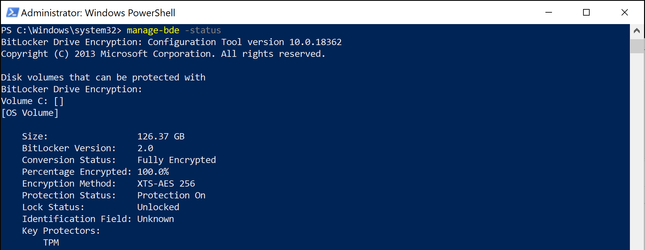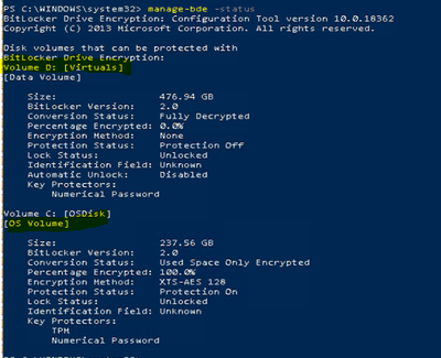 - Run Powershell command Manage-bde -status to check the status of bitlocker drive encryption (BDE)