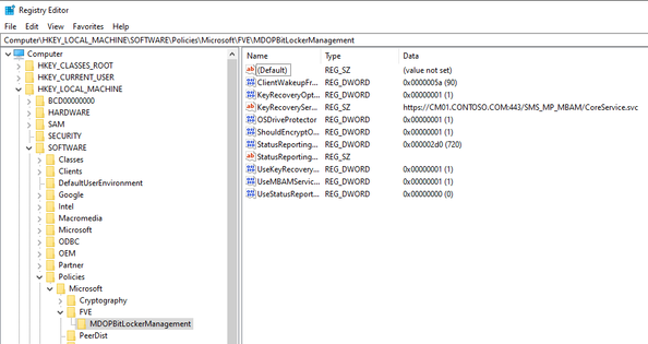 - Reg keys are created as shown below at Computer\HKEY_LOCAL_MACHINE\SOFTWARE\Policies\Microsoft\FVE\MDOPBitLockerManagement