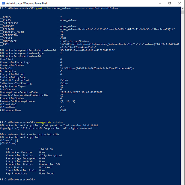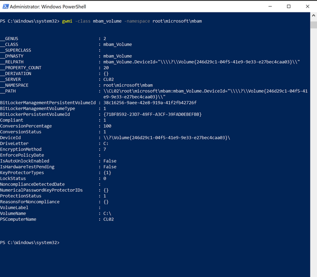 - Run Powershell command gwmi -class mbam_volume -Namespace root\microsoft\mbam. search for Compliant and ReasonsForNoncompliance