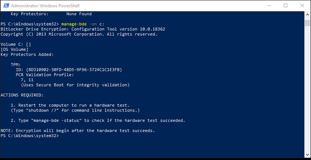 - In this scenario, Run Powershell command Manage-bde -on c: and restart computer to begin encryption of C drive by Bitlocker Drive Encryption (BDE)