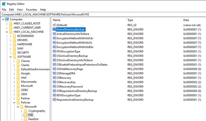 - You can check if recovery backup to active directory is enabled from registry HKLM\Software\Policies\Microsoft\FVE as shown below