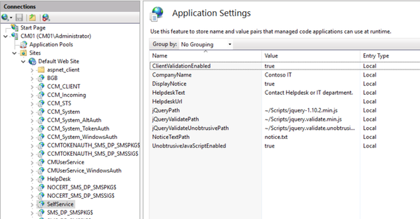 - After installation of self-service portal, you can customize portal. Go to Sites>Default Web Site>SelfService node. In the details pane, ASP.NET group, click Application Settings.