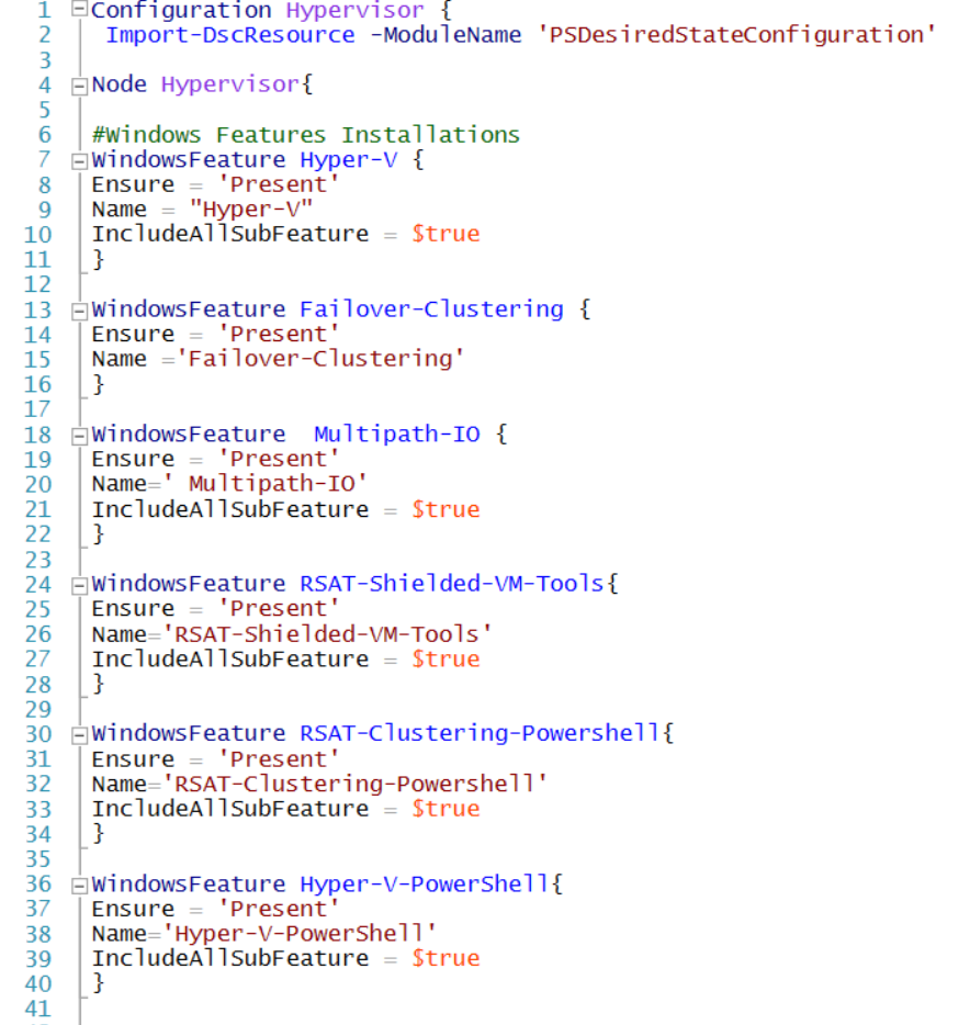 In each blog posting, I will address another item in our checklist and by the end, we should have a Highly Available Server 2016 Hyper-V Cluster with a well-defined cluster network and storage solution. This will be fun. To start, let’s begin with the configuration itself. We need to define the configuration name and node definitions. We will be using a single configuration, so we will not need to define node variables, but if we wanted, we could use a technique called Partial Configurations. Here is a great article on that: https://docs.microsoft.com/en-us/powershell/dsc/partialconfigs In our example though, we will be keeping things simple and defining our configuration for one purpose, to deploy a Hyper-V host. The host will need a few roles, like Hyper-V, Failover clustering and the PowerShell modules for each installed. For this we will be using the Windows Feature Resource in DSC. https://docs.microsoft.com/en-us/powershell/dsc/windowsfeatureresource Here are the roles I am installing on this Hyper-V Host to start with: I am utilizing the Windows Feature Resource in DSC to Declaratively say, I would like to ensure each Feature is installed or “Present,” and I am including the sub features included for the Role/Feature. This configuration will ensure the Hyper-V Role, as well as the Features like Failover-Clustering, Multipath-IO and the PowerShell Modules for managing Hyper-V and Failover Clustering, are installed on every Server that is configured to “Pull” this DSC Configuration. The next item on our list is to ensure that Remote Management of our Host is enabled and that we have settings like UAC configured. We will be using a few modules to accomplish this, so you will need to define these as DSC Resource. We will Import these resources at the beginning of our configuration and you can see that in my configuration here: I also went ahead and created a default folder for our VMs to be stored in, outside of the Cluster Shared Volumes we will be creating in a subsequent post. In addition, I have given you an idea of how we can use the xHyper-V module to create an Internal VSwitch on our Hyper-V host. I am happy with the results so far, we now have a DSC configuration that will install and ensure all the Roles and Features we need for a Hyper-Visor are present. We also have some basic settings like Time Zone and Remote Management set as well, and we started some of the configuration we will need by creating a default location for Virtual Machines on our Hosts, as well as a Virtual Switch for our VMs to utilize. I am only using this in a stand-alone configuration. In a Hyper-V Cluster configuration, this would be one of the Cluster Shared Volumes (CSVs). The last thing we need to do is to compile our Configuration and Publish it to our Pull server. To compile our configuration, we need to “dot-source” the script in PowerShell by running the script. This will resolve all of our variables, and create the folder location and file itself for a MOF document. The MOF is the configuration document that we will be publishing to our DSC Pull server. I will leave you with the full configuration I have written so far, so that you can use it in your examples and testing. In the next post, we will begin configuring our node(s) to be members of a Hyper-V Cluster and begin setting the Highly Available aspect of our Hyper-V Hosts. I look forward to your comments and questions. Happy Scripting!