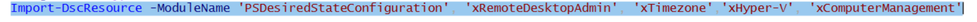 Import-DscResource -ModuleName 'PSDesiredStateConfiguration', 'xRemoteDesktopAdmin', 'xTimezone','xHyper-V', 'xComputerManagement'