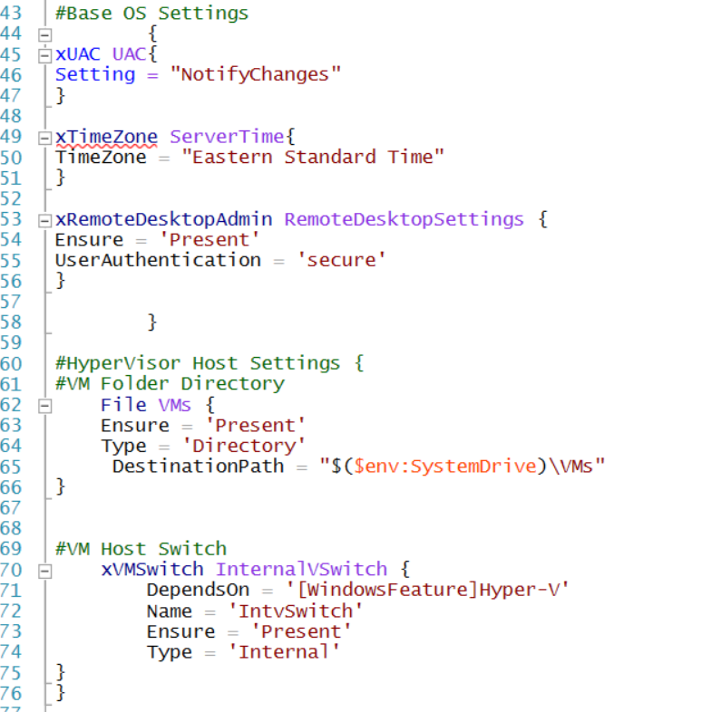 Hello, my name is Michael Godfrey and I am a Platform's Premier Field Engineer (PFE) at Microsoft. I have been a Fabric Administrator for the past few years and have made it a habit of building quite a few Hyper-V Hosts. I was always looking for a way to ensure my team and I knew the exact way to build a Hyper-V or ESXi host in the same way, consistently. I used many different methods of deploying hosts, including the Bare-Metal Deployment method in System Center Virtual Machine Manager. Yet I was always looking for the next great method of deployments, one that could be used not just for Hypervisors, but for virtual machines and physical machines and in varying different methods of configurations. Recently, I started to learn PowerShell DSC for one of my customers and we came across an issue regarding Hypervisor Host health. We were finding inconsistencies in the way the hosts were built and we wanted a way to streamline the deployment process for our hosts, as well as a way to monitor their compliance. So, naturally I decided to build out a DSC Configuration for a Hyper-V Host. I wanted to share that process, and start with a several part series on deploying a Hyper-V Host via DSC. I want to let the code do the work for me, so that I can scale this solution for future builds. So, I wanted to set some goals in the deployment and will use this series to track my progress: