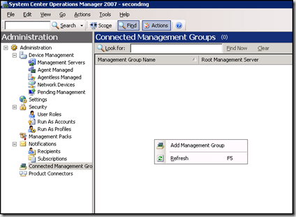To start configuration, connect to the OpsMgr console of the top level management group and navigate to the administration node. On the administration node click on 'Connected Management Groups' In the detail pane, right click on an open area and select 'Add Management Group'
