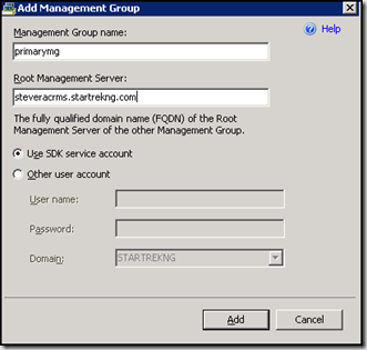 Note: If your management groups are not in the same domain and don't share a trust, you will have to create pass through accounts in the connected management group domain to allow authentication to work properly.