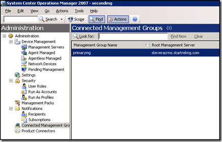 Connected management groups is the mechanism in OpsMgr to allow a 'single pane of glass' view of an OpsMgr environment with more than one management group. This is the OpsMgr answer to the MOM-to-MOM connector available in MOM 2005.